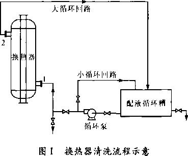 凝汽器換熱器是一種結(jié)構(gòu)緊湊、高效的換熱設(shè)備,被廣泛應(yīng)用于冶金、石油、制藥、船舶、紡織化工、醫(yī)藥、食品等行業(yè),是實現(xiàn)加熱、冷卻、熱回收、快速滅菌等用途的優(yōu)良設(shè)備。但是,由于凝汽器換熱器長期運行,用來冷卻或加熱側(cè)純凈程度的不同以及工藝介質(zhì)本身性質(zhì)的差異導(dǎo)致凝汽器換熱器結(jié)垢已成必然,同時因凝汽器換熱器本身結(jié)構(gòu)特點及規(guī)格型號的不同,導(dǎo)致結(jié)垢程度也不一樣,結(jié)垢后使內(nèi)部通道截面變小甚至堵塞,造成凝汽器換熱器換熱效率降低,從而影響生產(chǎn)的正常進行和設(shè)備的安全。因此,凝汽器換熱器應(yīng)定期進行清洗,除掉污垢,以保證凝汽器換熱器的高效換熱和生產(chǎn)的正常進行。在結(jié)垢嚴重、成分復(fù)雜的情況下,一般普通的物理方法不易清洗,且拆洗過程費時費力,本文針對凝汽器換熱器著重研究了化學(xué)清洗的工藝,此工藝簡單,費用相對物理清洗可能較高,但省時省力,處理效果相對較好,應(yīng)用很多。