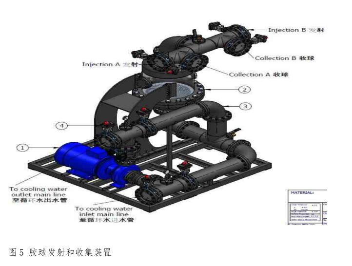 (2)、膠球發(fā)射和收集裝置采用集成站式安裝,包括膠球泵、膠球捕.獲器氣動(dòng)閥門和部分膠球管路。采用揚(yáng)程為20m的膠球泵,提高膠球發(fā)射能力,將膠球清洗管路由DN100改造為DN200,并內(nèi)部襯塑,防海水腐蝕。管路走向進(jìn)行優(yōu)化,減少?gòu)濐^數(shù)量,降低水阻。可提高一次發(fā)射膠球數(shù)量到3000個(gè)。設(shè)計(jì)膠球收集器,捕捉后的小球?qū)⒈蝗克突厥占鲀?nèi),在這里球體表面殘留的清洗下來的極少量污垢被洗去并排走。此時(shí)干凈的小球.被留在收集器內(nèi),等待下一次注射和清洗。收集器是膠球發(fā)射的起點(diǎn)和回收的終點(diǎn),膠球不通過膠球泵,膠球泵葉輪對(duì)膠球沒有磨損,從而提高清洗效果。