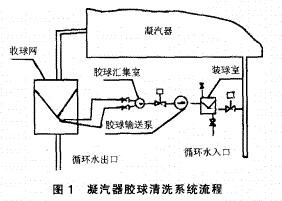 卻水系統(tǒng)的出口,通過(guò)一個(gè)篩板裝置,將清洗球從冷卻水里篩濾出來(lái)。篩濾出的清洗球由一臺(tái)回收泵