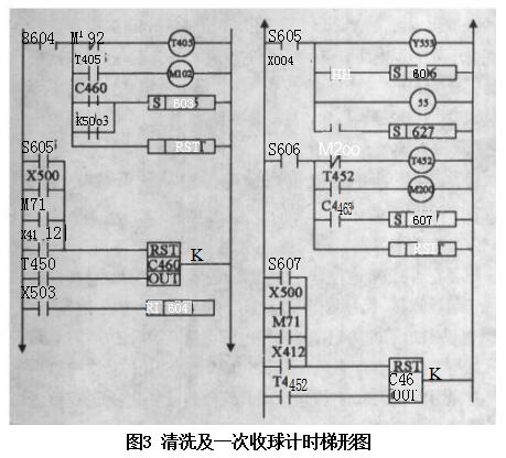 圖3清洗及一次收球計(jì)時(shí)梯形圖硬件上,可編程控制器的9路輸入用作執(zhí)行機(jī)構(gòu)的位置反饋信號(hào),16路輸入作為手動(dòng)控制信號(hào)及試燈、系統(tǒng)復(fù)位、差壓報(bào)警、手程控選擇等。輸出4路作為運(yùn)行狀態(tài)指示,另外10路是位置指示,剩下10路是指令輸出。