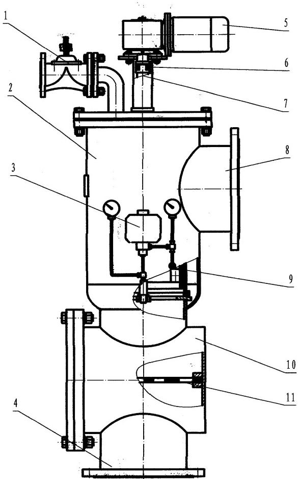 從圖1可以看出,全自動濾水器,工業(yè)自動反沖洗過濾器結構采用立式,二級分離(粗精過濾):一級分離(粗過濾)一些大的雜質污物,人工掏污;二級分離(精過濾)一些細小的雜質,設有粗濾筒10、精濾筒2、進水管4和出水管8,粗濾筒10設在進水管4上,筒內(nèi)設有粗濾網(wǎng)11;精濾筒2內(nèi)壁固定著精濾網(wǎng)9,在筒體底端用支撐定位環(huán)支撐著一個清洗軸7(附有刷子),清洗軸7的頂端通過棘6和電機減速器5聯(lián)接,精濾筒2上蓋板污水腔連接著自動排污閥1,另外在精濾筒2外壁上設有差壓開關3,一端聯(lián)接著進水管4,另一端聯(lián)接著出水管8。工作時污水從進水管4進入粗濾筒10,通過粗濾網(wǎng)11的粗過濾,進入精濾網(wǎng)9內(nèi),通過精濾網(wǎng)9過濾后由出水管8流出,經(jīng)過一段時間工作后,濾網(wǎng)9內(nèi)雜質增多,壓力升高,超過壓差設定值,差壓開關3發(fā)出信號,電機減速器5啟動清洗軸7進行清洗吸污、自動排污閥1打開排污,同時在自動排污閥1打開的瞬間,濾后水形成倒流,對精濾網(wǎng)9進行反沖洗,直至壓差降到設定值以內(nèi)。