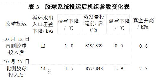 從表2可以看出,9月5日六期13號(hào)機(jī)組膠球清洗系統(tǒng)因?yàn)槟蟼?cè)裝球室切換閥壞和凝汽器北側(cè)銅管漏,停運(yùn)膠球系統(tǒng)以后,造成循環(huán)水入口壓力增加,出口壓力下降,這是凝汽器銅管循環(huán)水通流量明顯下降的征兆,直接導(dǎo)致機(jī)組真空下降,端差增大。10月12日、17日投入膠球后參數(shù)變化見表3。