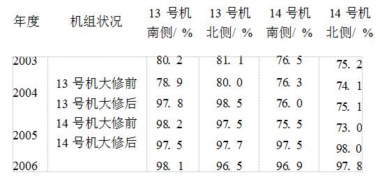 13號(hào)、14號(hào)機(jī)組2014年以前由于收球率一直不合格,在2014年、2015年的機(jī)組大修中對(duì)相關(guān)系統(tǒng)做了一些改造。