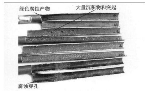 在電廠運(yùn)行中發(fā)現(xiàn)機(jī)組冷油器有異常,汽動(dòng)泵冷油器油質(zhì)急劇惡化,油中帶水嚴(yán)重;停機(jī)檢查發(fā)現(xiàn)銅管出現(xiàn)大面積腐蝕泄漏。抽管干燥后觀察銅管內(nèi)沉積物較多,呈藍(lán)綠色;銅管外側(cè)(油側(cè))表面光潔、紋路清晰;沉積物下有一薄層紫紅色片狀膜,除去后方顯金屬本色;沉積物下有局部腐蝕坑,坑周圍沉積物顏色更綠;有的地方已腐蝕穿孔。宏觀照片見圖1