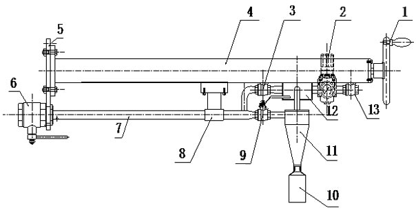 1、取樣工作原理 推入式煤粉取樣裝置是利用負(fù)壓抽吸和旋風(fēng)分離原理將氣粉混合物從煤粉管道中抽吸出并進(jìn)行固氣分離而研制成功的。取樣前所有閥門全為關(guān)閉狀態(tài),取樣時打開球閥13;調(diào)整壓縮空氣調(diào)壓閥,將壓力調(diào)整到合適的壓力時,打開球閥6、3、9;搖動手輪1;傳動管(4)內(nèi)螺桿旋轉(zhuǎn)帶動取樣管7緩緩進(jìn)入煤粉管道中開始取樣,取樣時所有閥門為開啟狀態(tài),當(dāng)壓縮空氣從出氣管道經(jīng)過射器抽氣器,其射流作用必然導(dǎo)致旋風(fēng)分離器、取樣管、取樣瓶等部件產(chǎn)生負(fù)壓,促使煤粉管道中的氣粉混合物沿取樣管進(jìn)入取樣裝置,氣粉混合物在旋風(fēng)分離器中進(jìn)行固氣分離,分離出的煤粉落入旋風(fēng)分離器下面的取樣瓶中,氣體則被壓縮空氣抽吸從新送如煤粉管道中,整個操作過程對工作場所不產(chǎn)生污染。取樣前對壓縮空氣調(diào)壓閥進(jìn)行調(diào)整,可實(shí)現(xiàn)等速取樣,使取出的煤粉樣品具有代表性。(壓縮空氣壓力一般不超過0.1Mpa)。