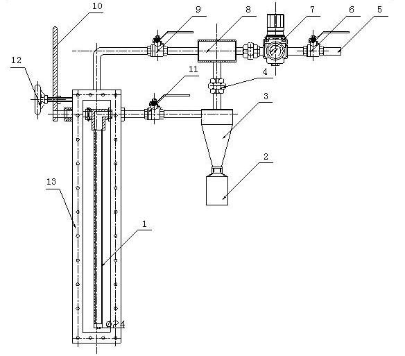 該產(chǎn)品主要由1.取樣管、2.取樣瓶、3旋風(fēng)分離器、4.連接活接頭、5.進(jìn)氣管道、6.壓縮空氣控制閥、7.壓縮空氣調(diào)壓閥、8.射器抽氣器、9.吹掃閥、10.取樣操作桿、11.取樣閥、12.定位手輪、13.外殼體等部分組成。各部分功能如下: